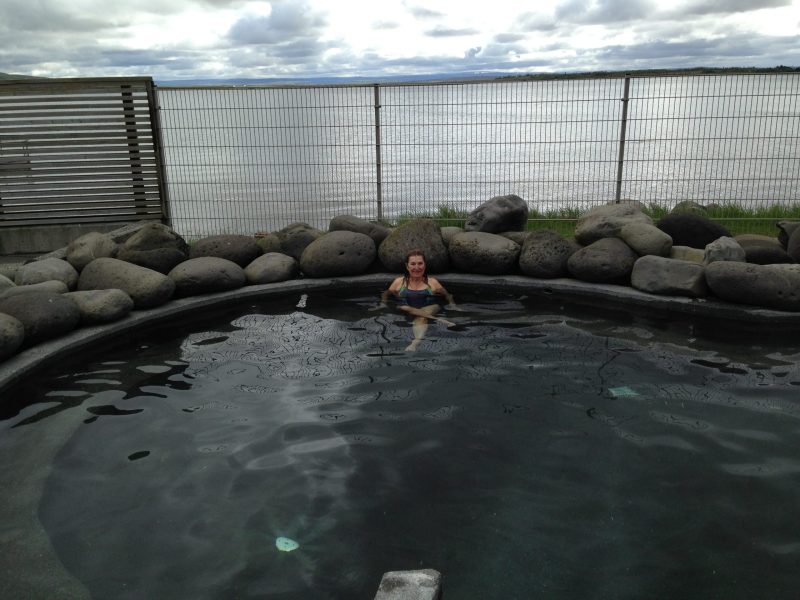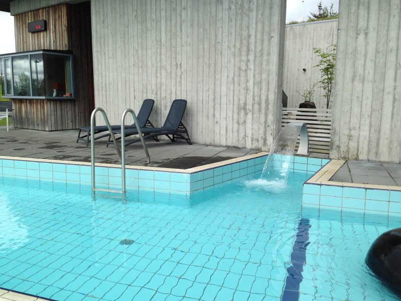A continuación fuimos al spa del Hotel Fontana. Nos lo recomendó una islandesa de la oficina de turismo de Borgarnes. Nos dijo que para el famoso Blue Lagoon había que reservar día y hora y que vendría a costarnos mínimo 80€. Éste nos costó 30€. Además como era temprano sólo estábamos una familia, una pareja y nosotros. Todas las instalaciones al aire libre. Las piscinas tenía la temperatura marcada con un cartel de 32ºC/34ºC/38º-40ºC/39º-40ºC. En las afueras del spa había una zona que avisaba del peligro de termas a 100ºC.